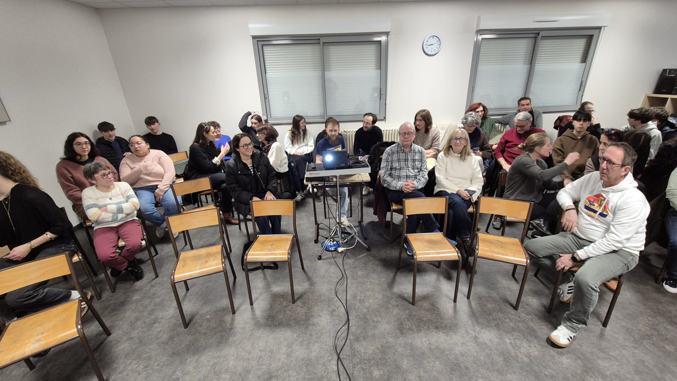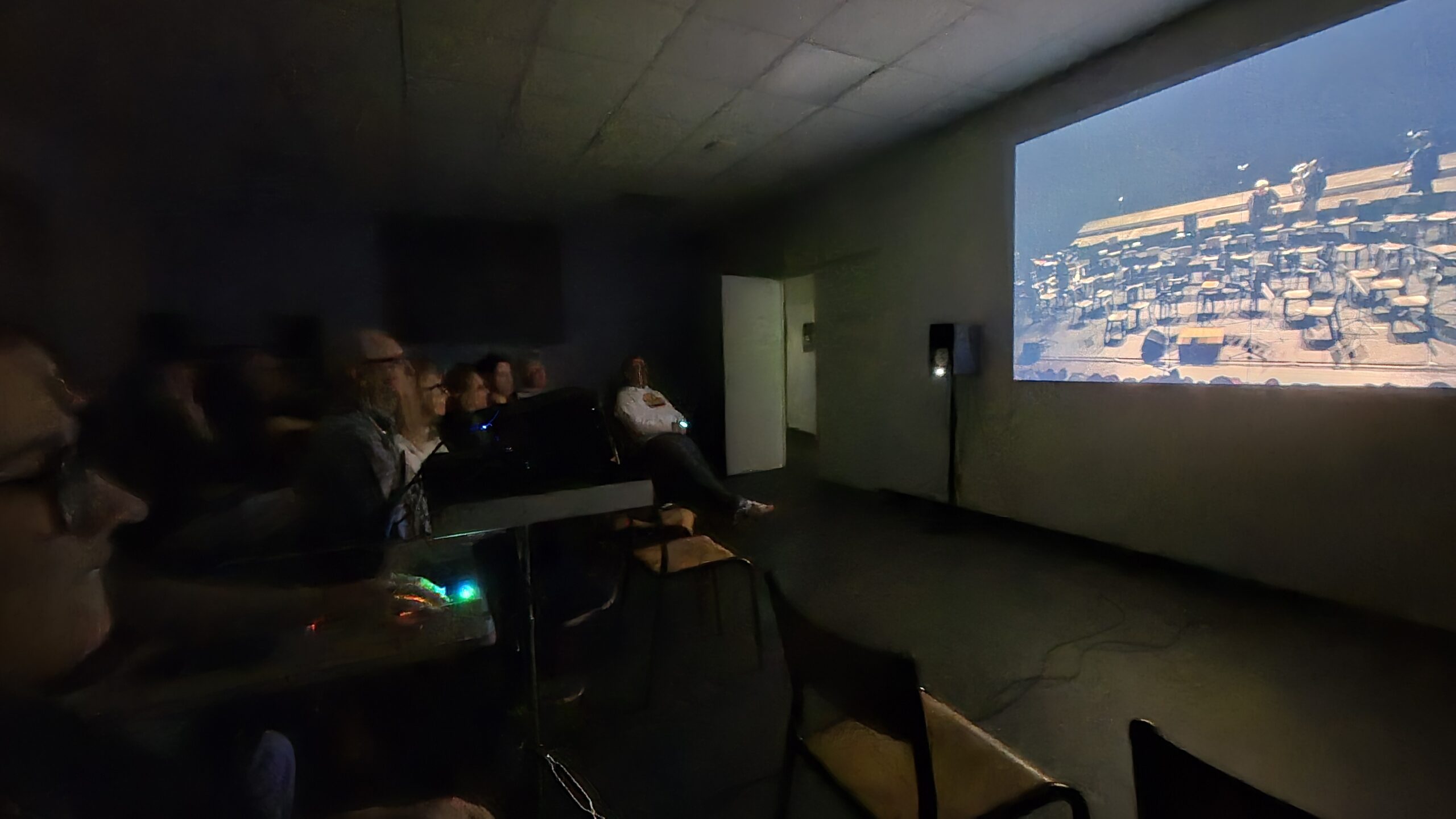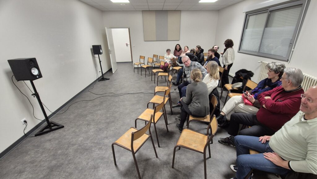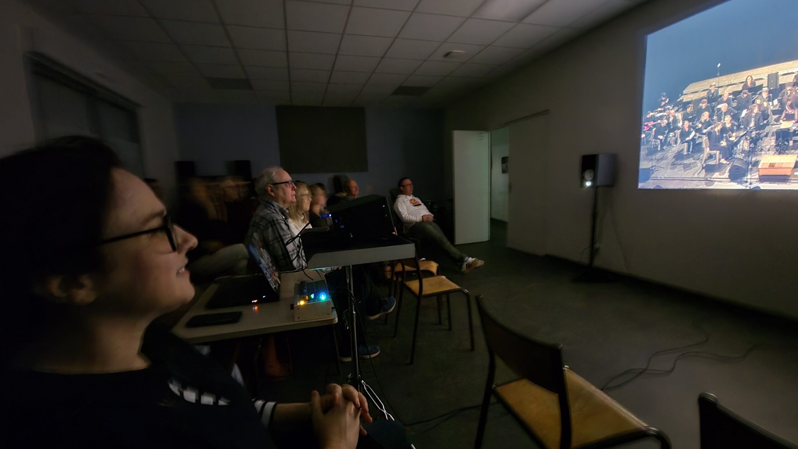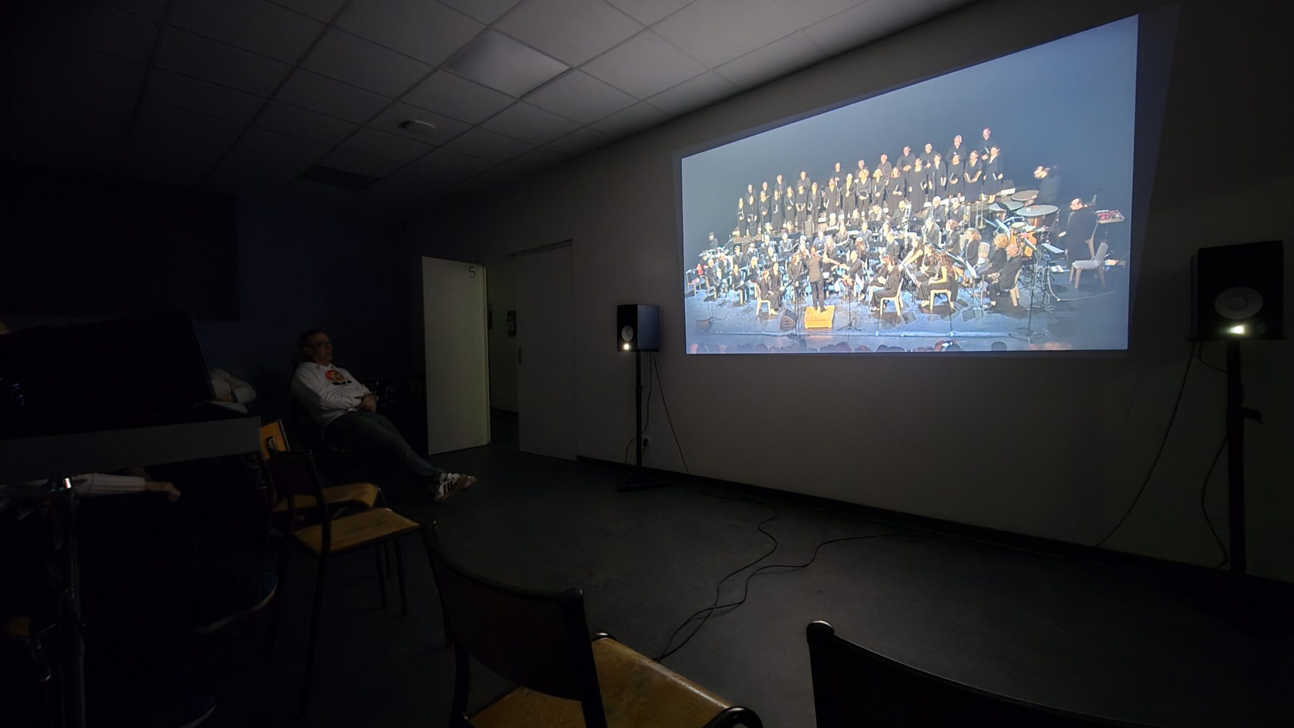Après une rapide transformation de la salle — installation du matériel vidéo, alignement des chaises… mais pour une fois pas un seul pupitre en vue, ce qui a déjà fait sourire plus d’un musicien — la projection a pu commencer dans une atmosphère attentive et presque solennelle.